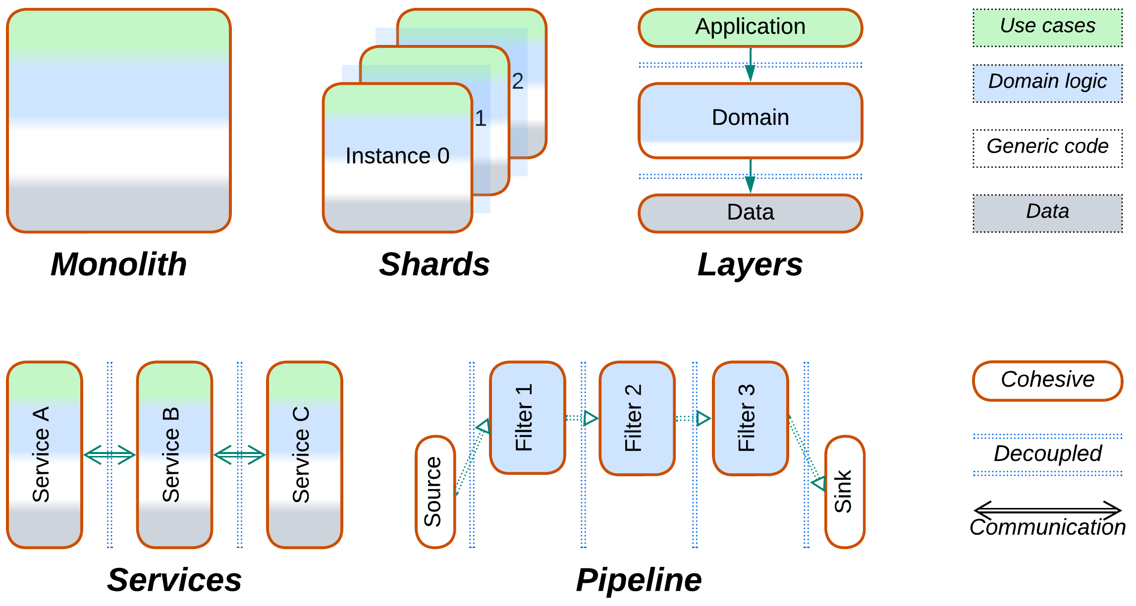 - Decoupled subdomains allow for multi-team development and large codebases but complicate global use cases. Decoupled layers enable variation in technologies within a subdomain and limit interdependencies between subdomains to a single layer.