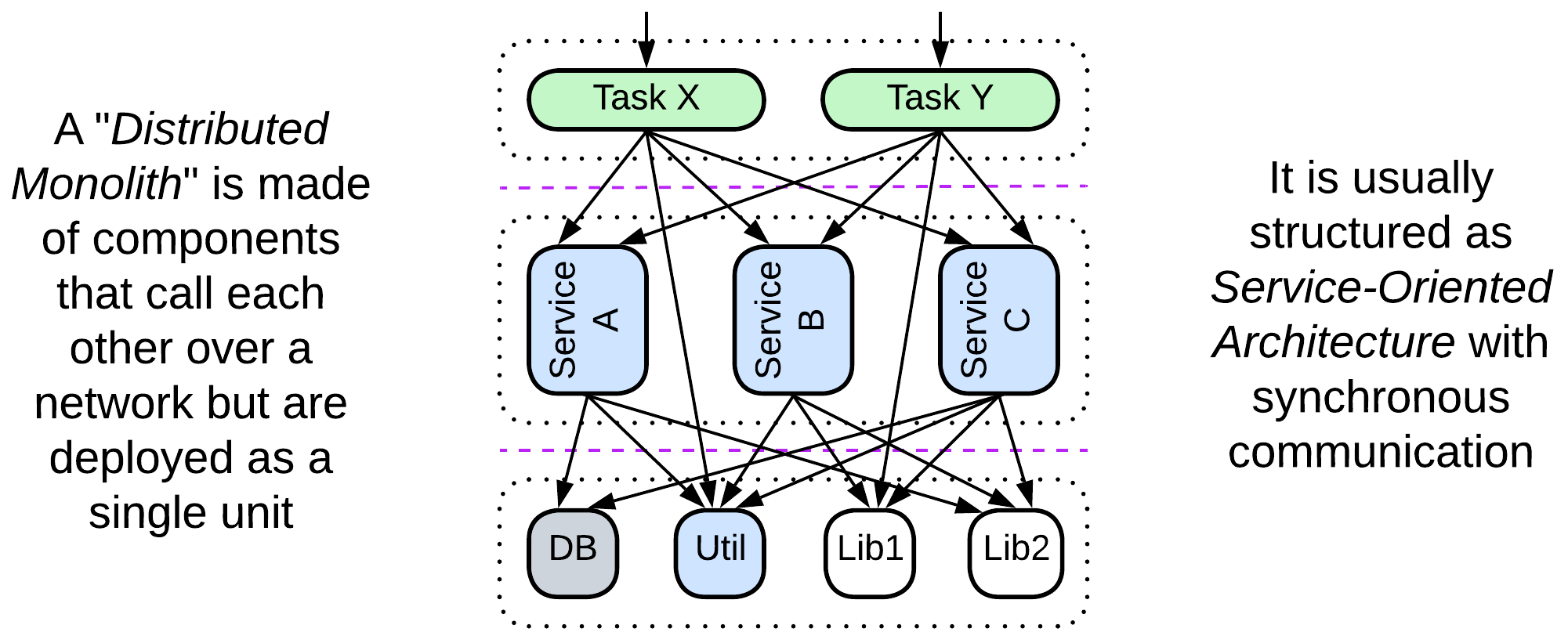 A Distributed Monolith [MP] is a highly distributed system (usually Service-Oriented Architecture or Services) where all the components still need to be deployed together because of their interdependencies. It is said to have the drawbacks of both Monolith (low fault tolerance and coupled release cycles) and Services (poor debuggability, high latency, and operational complexity).