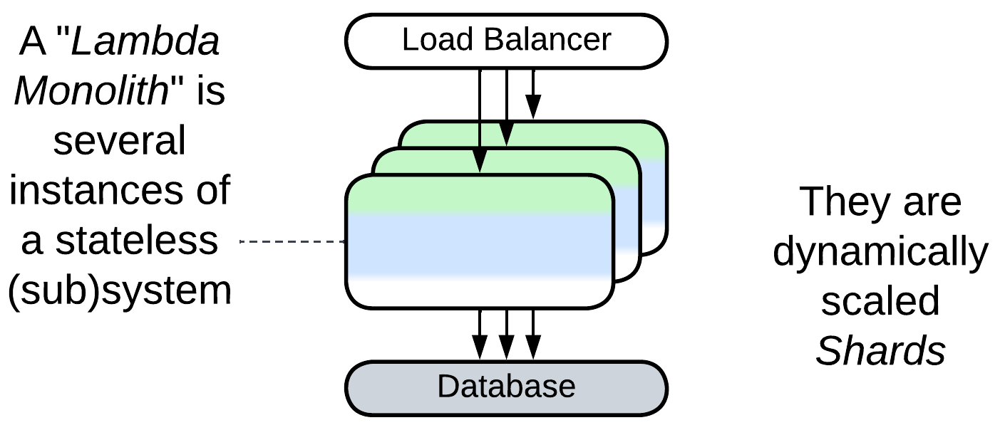 A Monolambda or Lambdalith is a dynamic Pool of stateless instances of a system. Though each instance may contain layers or subdomain modules, the whole is often called a Monolith because it is deployed as a single unit.