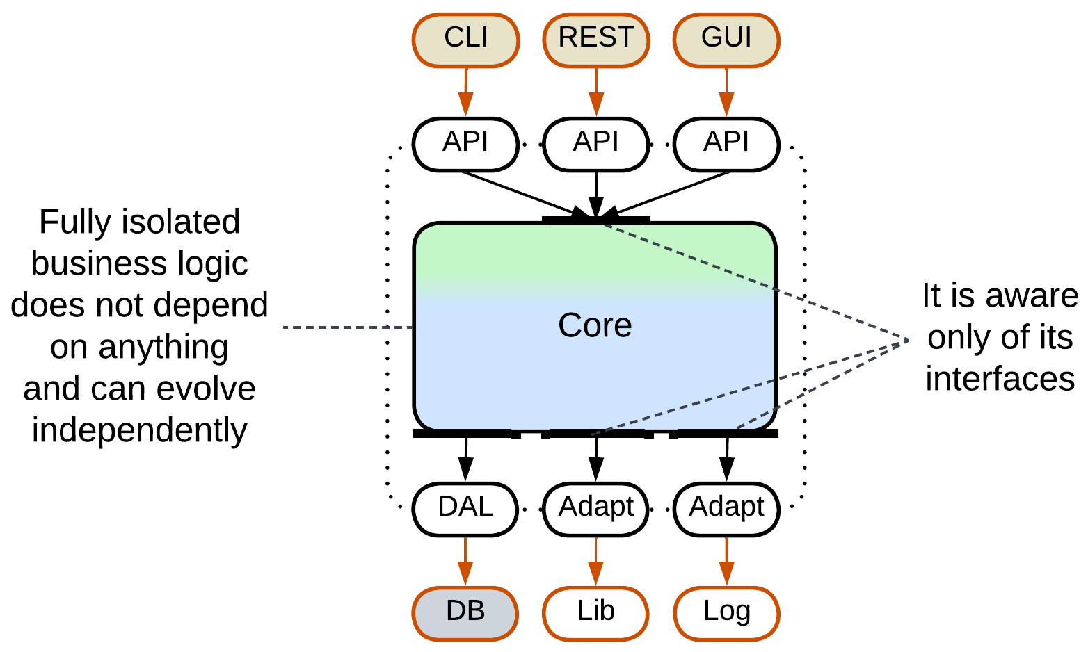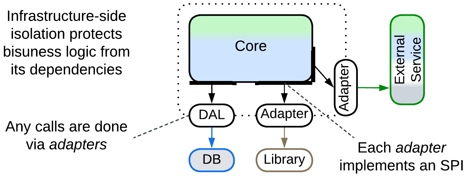 - Medium-sized or larger components. The programmers don’t need to learn details of external technologies and may concentrate on the business logic instead. The code of the core becomes smaller as all the details of managing external components are moved into their adapters.
