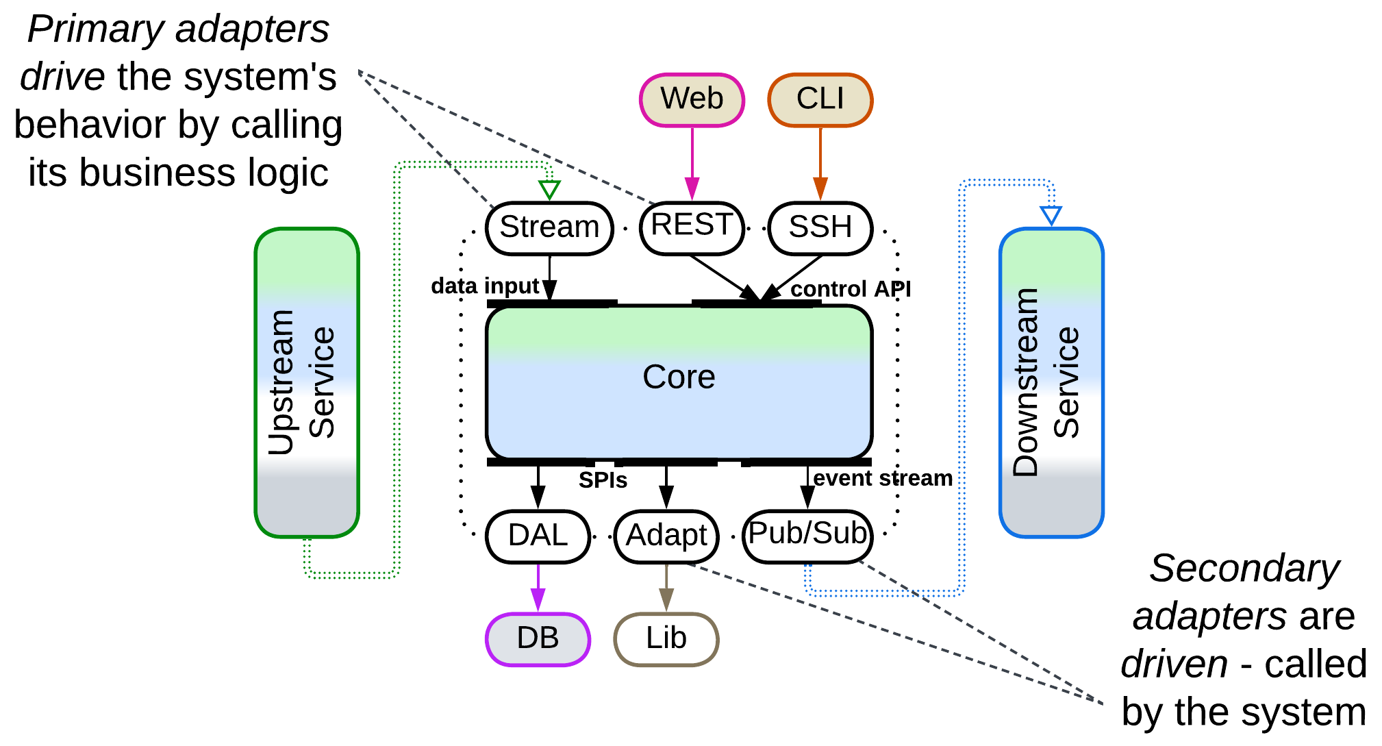 Each adapter breaks the dependency between the core that contains business logic and an adapted component. This makes all the system’s components mutually independent – and easily interchangeable and evolvable – except for the adapters themselves, which are small enough to be rewritten as need arises.