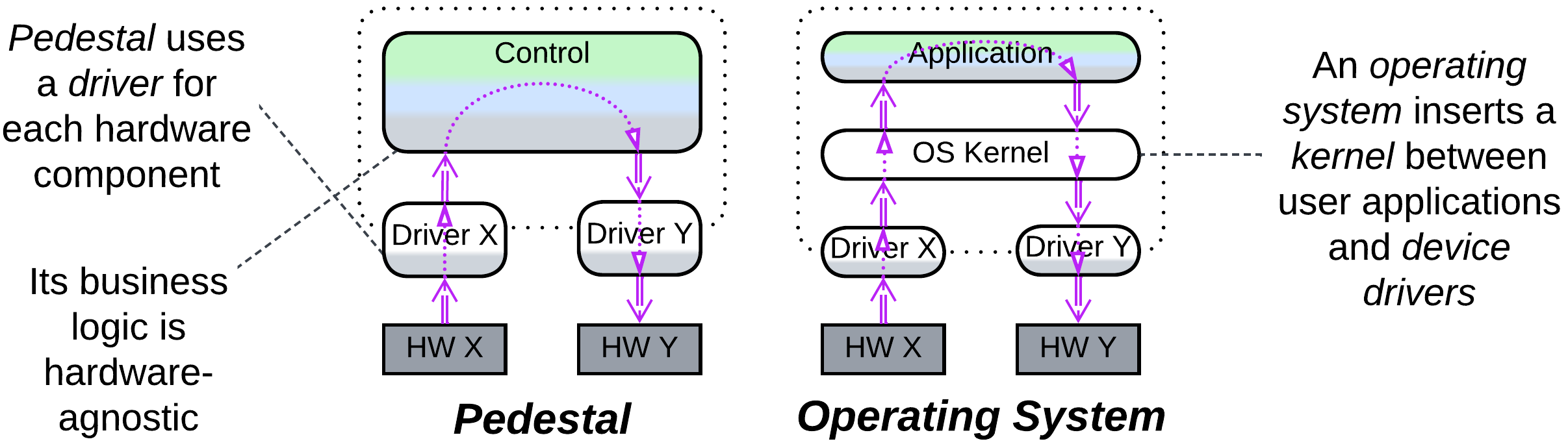 Pedestal is named after the shape of its diagram and describes a system that operates multiple hardware components. On one hand, software takes years to write and stabilize. On the other hand, there are many versions and even vendors for each kind of hardware component, and they change over years. Therefore, the bulk of the software that contains the system logic (called control) is decoupled from the hardware it manages through the use of hardware-specific drivers. As a result, changes in hardware require updates only to matching drivers, the business logic remaining intact.